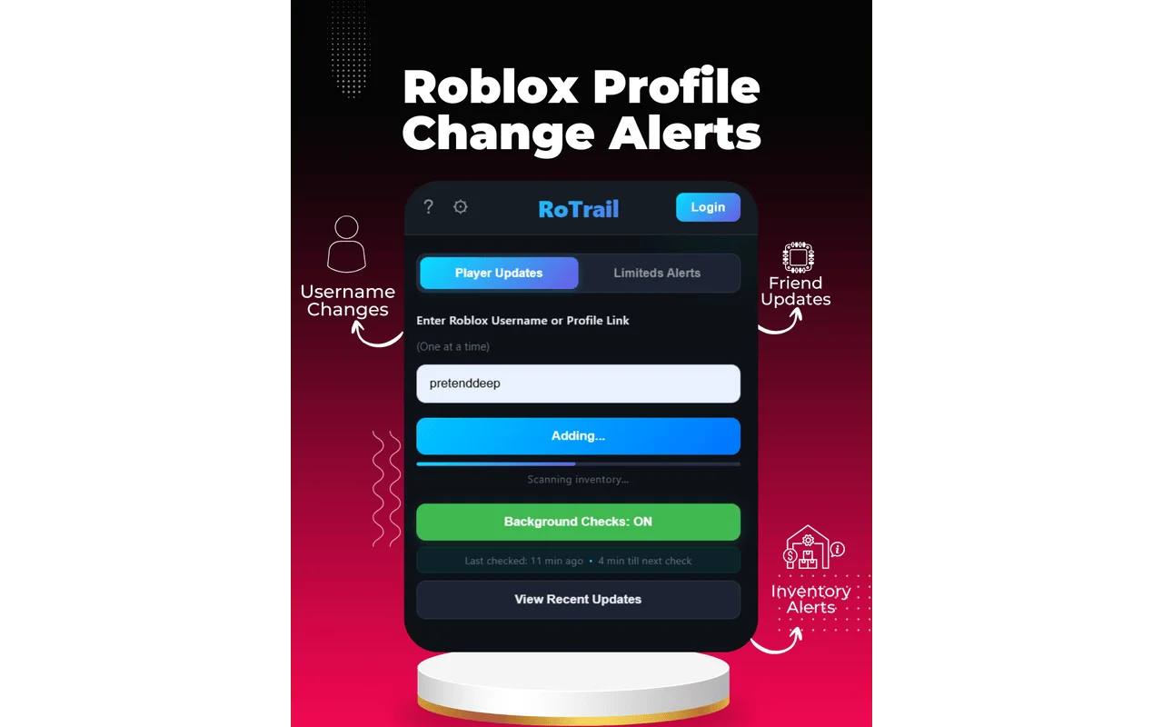 Roblox has over 70 million daily active users, and profiles change constantly. Usernames get swapped, rare items change hands, friend lists shift overnight. For traders, knowing the exact moment a limited item appears in someone's inventory can mean the difference between landing a deal and missing out entirely. For community moderators and group owners, tracking when members leave or join groups helps maintain oversight. For parents, a Roblox username tracker helps ensure kids aren't being contacted by strangers through friend requests. The problem is that Roblox doesn't natively notify you when someone else's profile changes — that's the gap that RoTrail was built to fill.